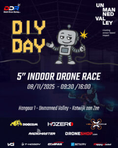 Op zaterdag 8 november vliegen we weer! Tijdens het DIY DAY evenement op Unmanned Valley β Katwijk aan Zee organiseren we een speciale indoor drone race. In de iconische voormalige hangar van